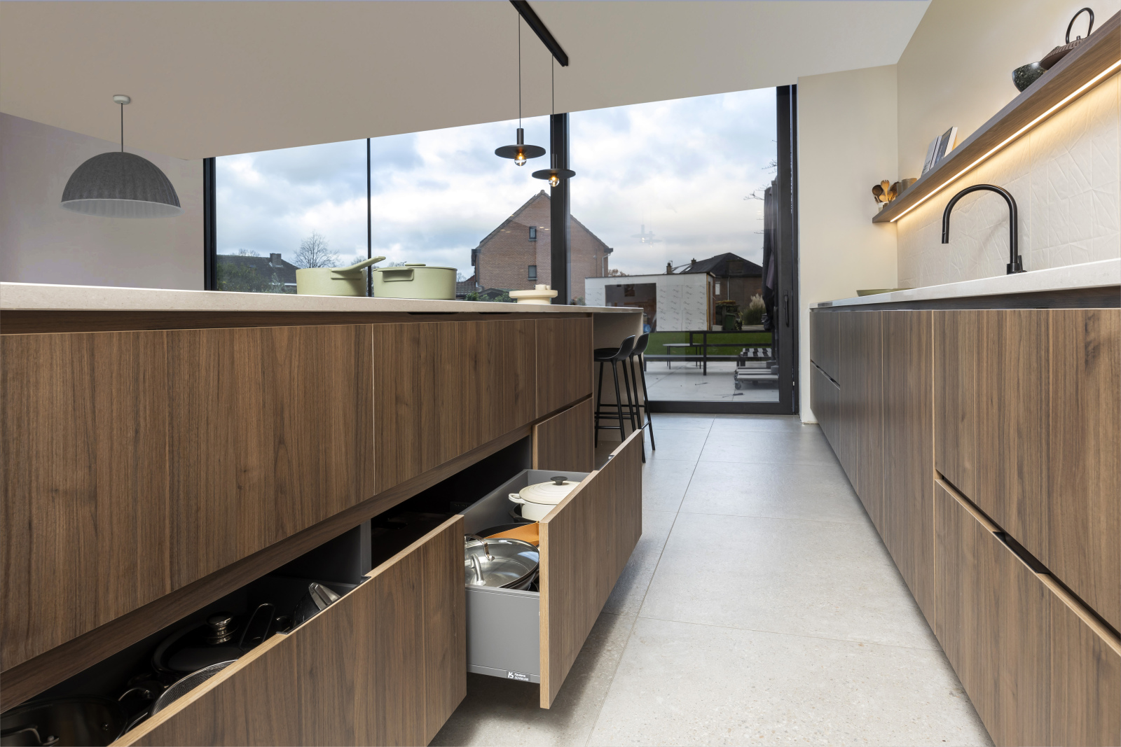 Deze moderne keuken straalt klasse en verfijning uit dankzij de combinatie van donkere houttinten en een composiet werkblad in Caesarstone Clamshell. Het eiland vormt het hart van de ruimte met een comfortabel zitgedeelte voor vier personen en een open element dat zorgt voor een luchtige uitstraling. Boven het spoelgedeelte voegt een zwevende legger met geïntegreerde ledverlichting extra sfeer en functionaliteit toe.
