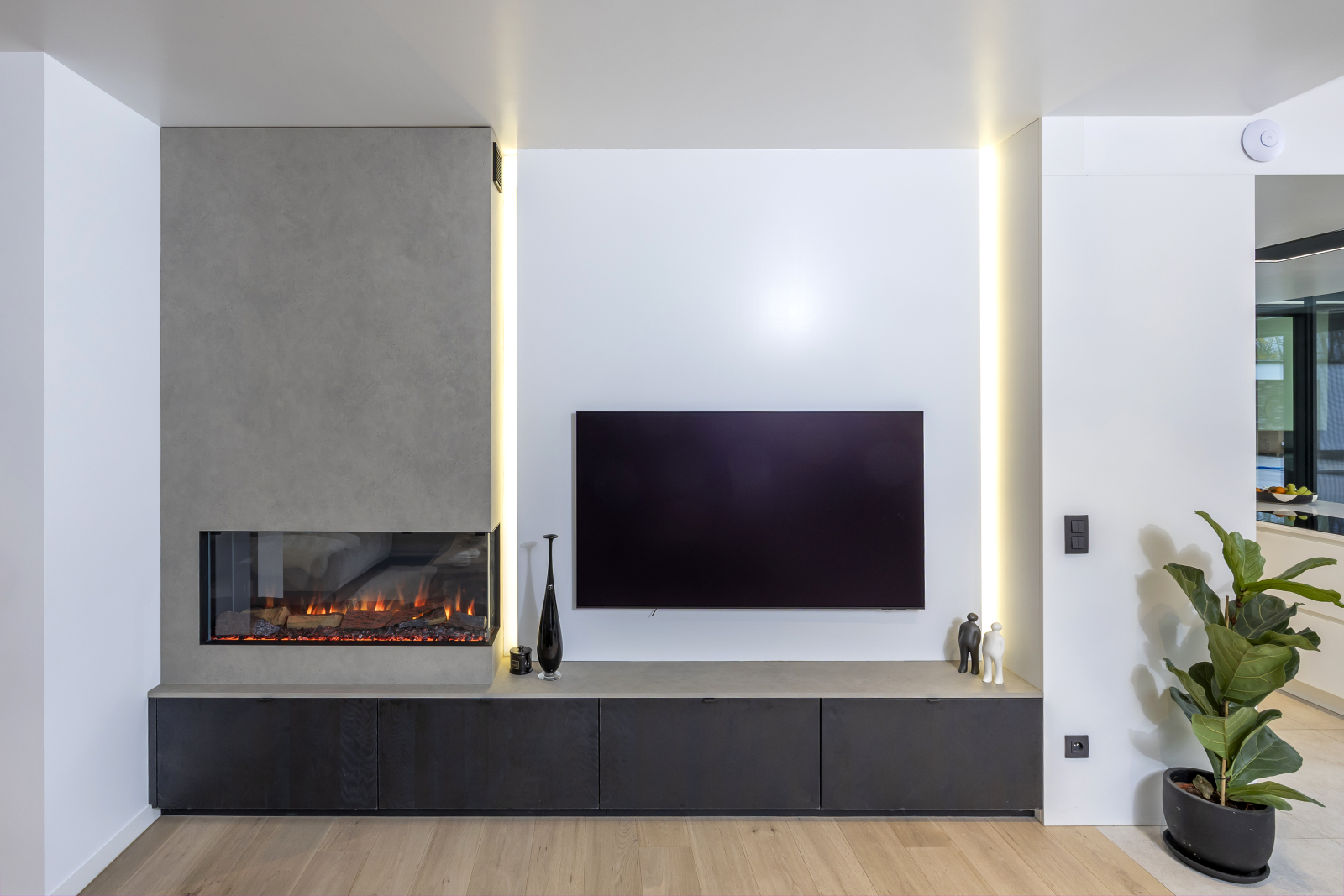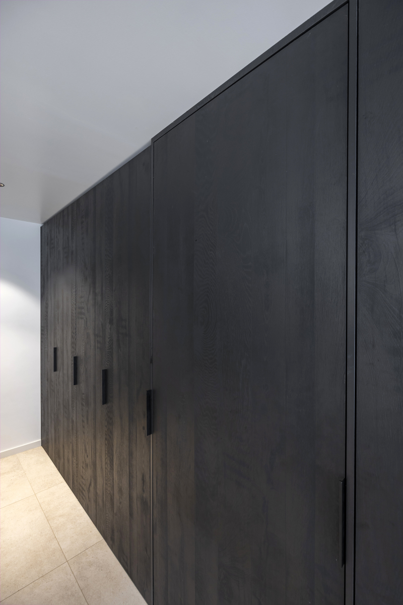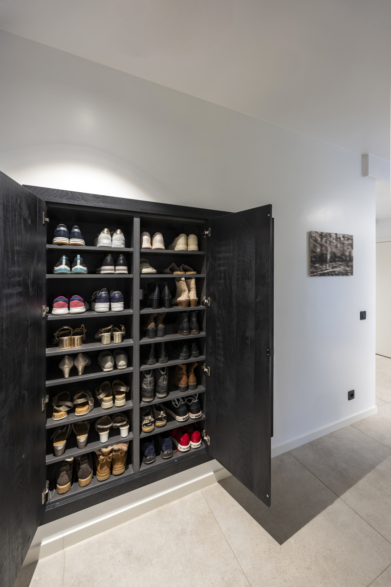 Het TV-meubel is ontworpen in dezelfde zwarte houtkleur en werd gecombineerd met een haardombouw en tablet in betonlook. Ook de halkast, die bedoeld is om schoenen op te bergen, werd ingewerkt in een nis met dezelfde kwalitatieve afwerking. Alle kasten zijn greeploos, met zwarte greep of van het pust-to-open model.