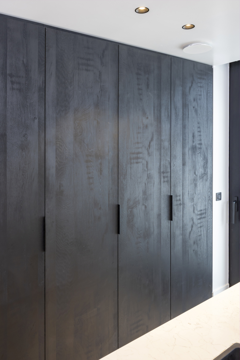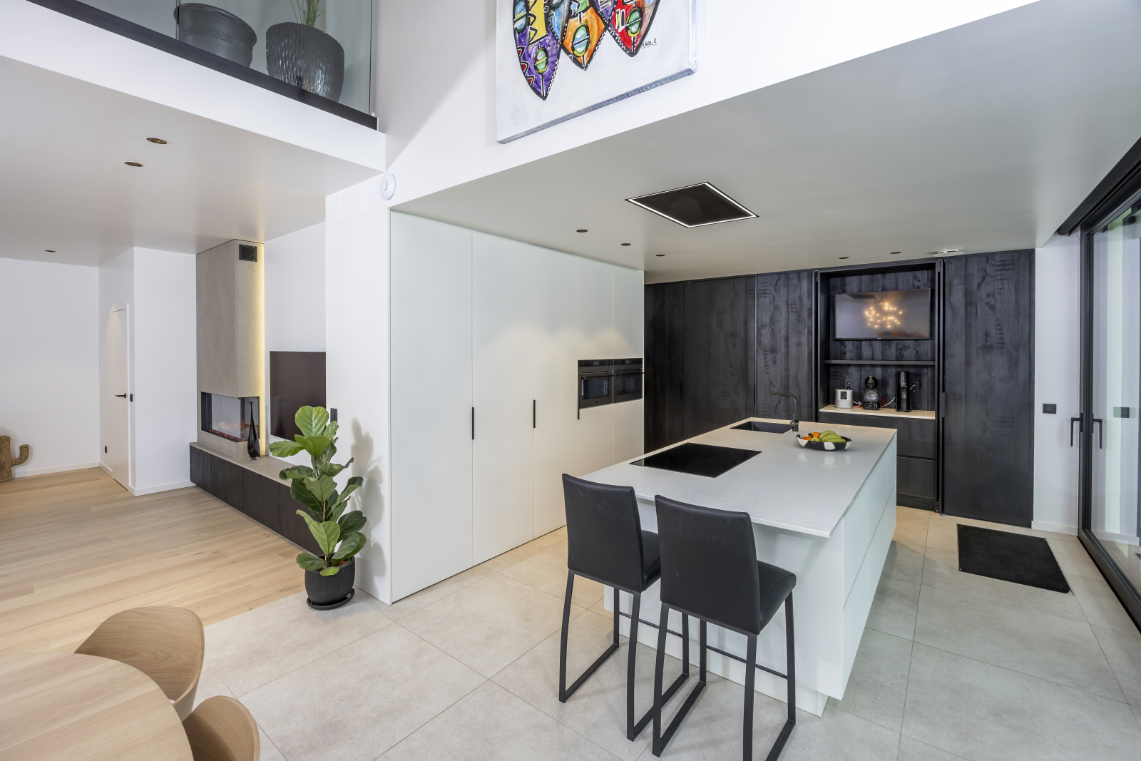 De strakke moderne keuken bestaat uit een wit eiland met composiet werkblad van Articom in de kleur Carrara Venato. Een kastenwand in dezelfde witte kleur contrasteerd mooi met de andere kastenwand in een warme zwarte houtkleur. In deze laatste werd een handige nis verwerkt met inschuifdeuren waar TV en koffie-apparaat een plaats vinden.
