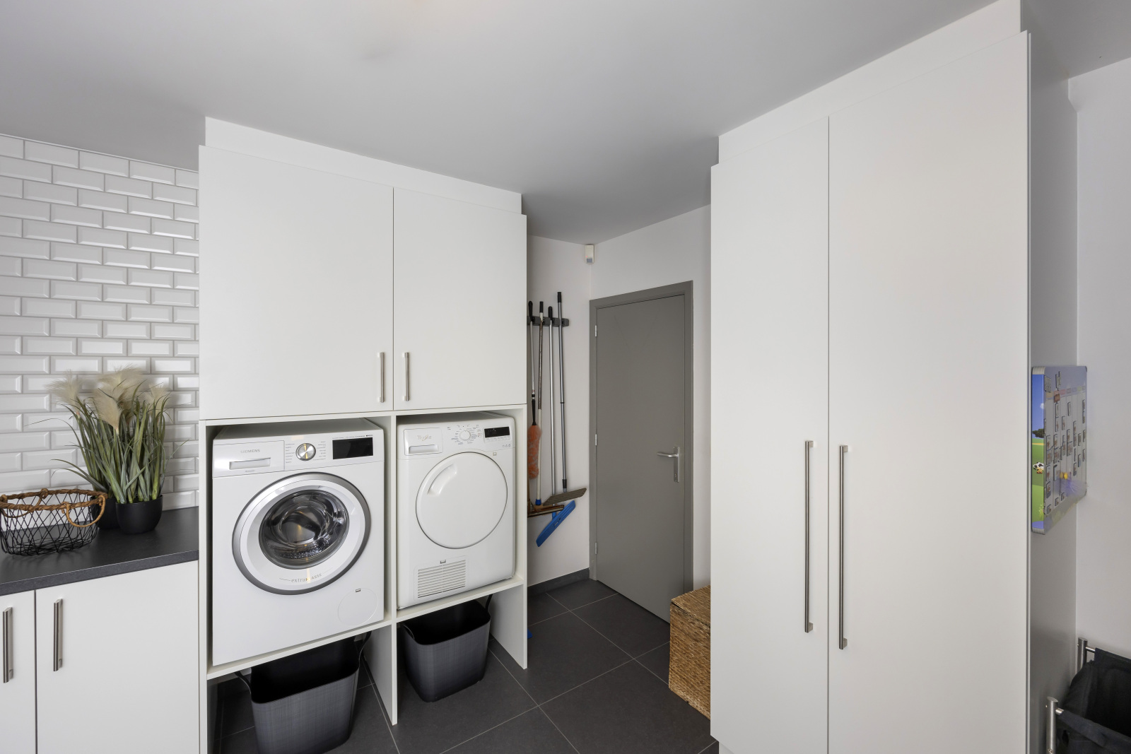 In de berging zorgen praktische kasten voor optimaal gebruiksgemak, met wasmachine en droogkast ergonomisch op hoogte.
