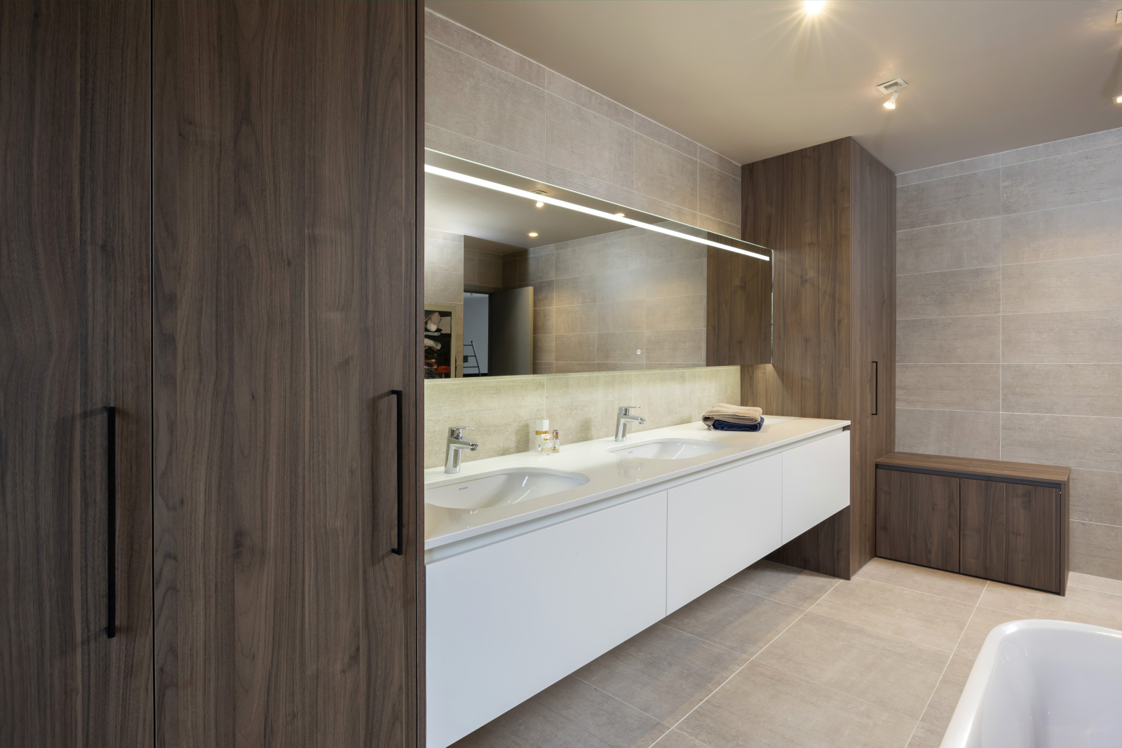 De badkamer straalt rust uit dankzij witte greeploze lades onder de lavabo’s, gecombineerd met kolomkasten in een warme notelaarkleur.