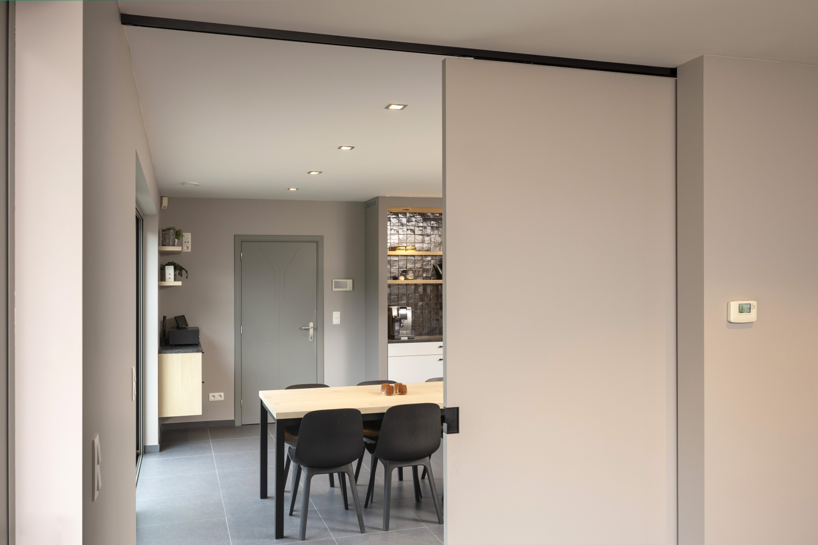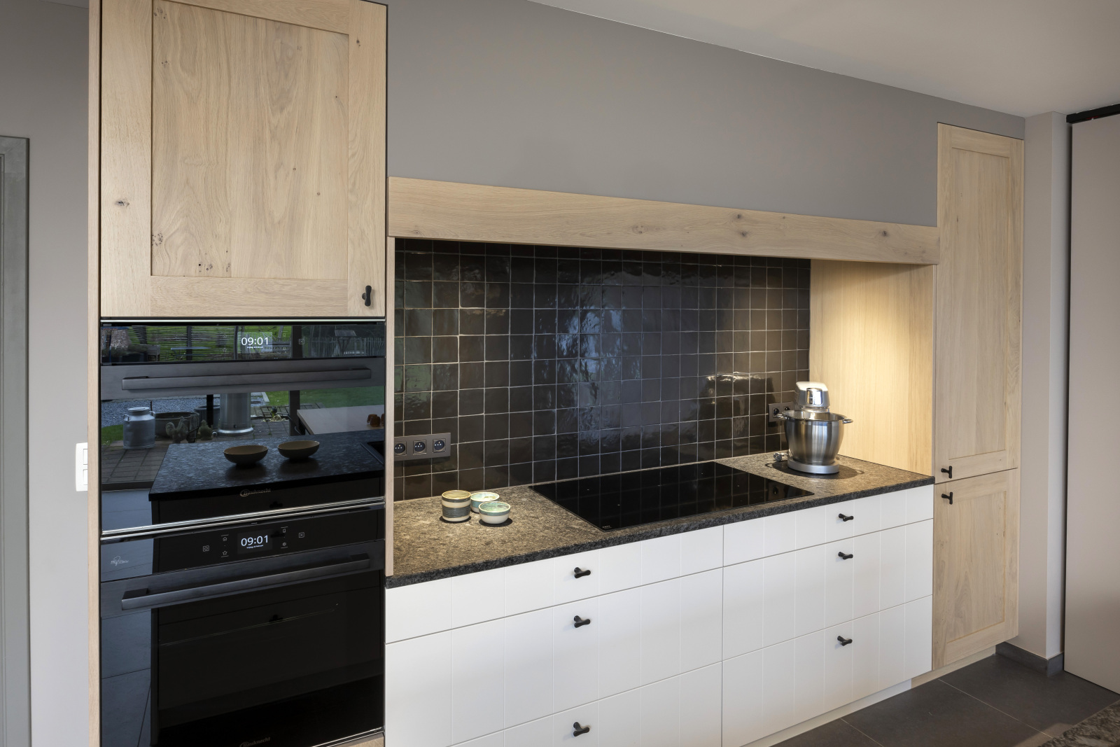 De landelijke keuken combineert warme eiken kaderdeuren met witte poederlakke, gegroefde fronten en wordt in balans gebracht door elegante zwevende leggers en een schuifdeur op maat.